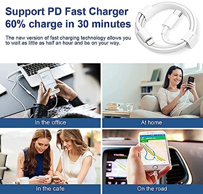 • 【Safety Efficient Fast Charging 】The Power Delivery Wall Charger for iPhone owns a built-in multi-protection system, avoiding over-voltage,over-charge,over-heat,etc.The smart chip including the MFi certified lightning cable match the current required by the Apple device automatically,charges your iPhone/iPad device fast,safely,and steadily.Tangle-free 6 Feet length is convenient for usage while charging and sync at home/office/travel in bed,hotel rooms, and more.